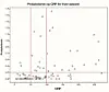 Siden både CRP- og PCT-konsentrasjonene øker ved bakterielle infeksjoner, kan sammenhengen mellom dem hos den enkelte pasient være av interesse. Spearman korrelasjonsanalyse viste en liten, men ikke statistisk signifikant, lineær sammenheng mellom CRP og PCT (r = 0.366, n = 93). Figur 2 viser et scatter-plot hvor sist målte CRP- og PCT-verdi for hver enkelt pasient er plottet mot hverandre. Visuelt kan vi ikke se den statistisk påviste svake sammenhengen mellom de to infeksjonsparametrene.